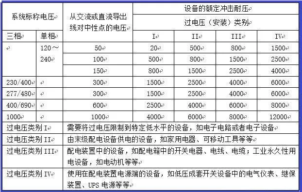 低压配电网可能遭受的电涌能量形式及数值大小;电气设备承受电涌冲击的能力;如何实现让电涌能量降低到电气设备能够承受的范围之内。低压配电系统的保护对象是低压配电网中的各类配电设备和用电设备。按照国家标准GB/T16935.1-2008《低压系统内设备的绝缘配合》,低压配电系统各类设备的额定冲击电压耐受值见下表: